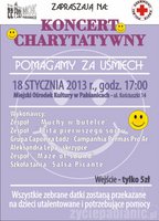 "Pomagamy za usmiech" to tytuł koncertu charytatywnego, na który wspólnie zapraszają Polski Czerwony Krzyż i Miejski Ośrodek Kultury im. Zbigniewa Herberta w Pabianicach. Impreza, z której dochód będzie przeznaczony na rzecz dzieci utalentowanych i potrzebujących finansowej pomocy, odbędzie się w piątek 18 stycznia o godzinie 17.00.