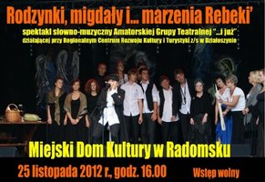 25 listopada o godz.16.00 odbędzie się w Miejskim Domu Kultury w Radomsku wernisaż wystawy „Kolory muzyki’. Jest to fotograficzne posumowanie 13 Wędrownego Festiwalu Filharmonii Łódzkiej „Kolory Polski”. Po otwarciu wystawy zapraszamy na spektakl słowno-muzyczny "Rodzynki, migdały i marzenia Rebeki" w wykonaniu Amatorskiej Grupy Teatralnej „I już” z Działoszyna.