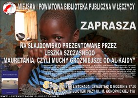 22 listopada 2012 r. o godz. 18.00 w Miejskiej i Powiatowej Bibliotece Publicznej w Łęczycy odbędzie spotkanie z cyklu „Podróże ciekawych świata”, tym razem pod hasłem: "Mauretania - czyli muchy groźniejsze od Al-Kaidy". Naszym gościem będzie globtroter - pan Leszek Szczasny, który opowie o swojej wędrówce przez Mauretanię.