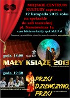 12 listopada Miejskie Centrum Kultury w Bełchatowie zaprasza na dwa spektakle. Wszystkich, którzy nie widzieli jeszcze przedstawienia pt. „Mały Książę 2013” w wykonaniu Teatru BAT zapraszamy na godz. 18:00. O godz. 19:30 młodzi aktorzy z Radomska aprezentują spektakl "Przyj, dziewczyno przyj".