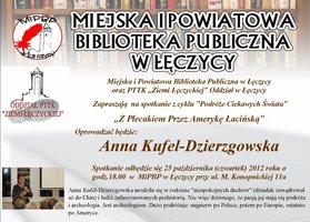 Miejska i Powiatowa Biblioteka Publiczna w Łęczycy oraz PTTK „Ziemi Łęczyckiej” Oddział w Łęczycy zapraszają na spotkanie z cyklu „Podróże ciekawych świata” z podróżniczką i archeolog panią Anną Kufel-Dzierzgowską. Spotkanie odbędzie się 25 października (piątek) 2012 roku o godz.18.00
