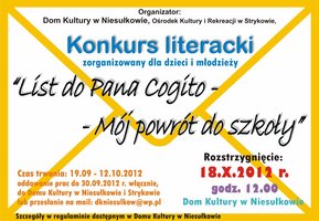 Do 12 października można nadsyłać prace na konkurs literacki „List do Pana Cogito - Mój powrót do szkoły” organizowany przez Dom Kultury w Niesułkowie i Ośrodek Kultury i Rekreacji w Strykowie. Konkurs adresowany jest do dzieci i młodzieży klas IV-VI szkoły podstawowej oraz I-III gimnazjum.