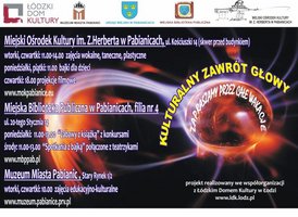 "KULTURALNY ZAWRÓT GŁOWY " to nazwa projektu kulturalnego Miejskiego Ośrodka Kultury im. Zbigniewa Herberta, który na jego realizację otrzymał dofinansowanie w konkursie ogłoszonym przez Łódzki Dom Kultury pod nazwą „Współorganizacja projektów kulturalnych na terenie województwa łódzkiego”. „Kulturalny zawrót głowy” to propozycja na niebanalne spędzenie wakacji dla uczniów pochodzących z mniej zamożnych rodzin.