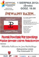 Biblioteka Publiczna im.Jana Machulskiego oraz Partnerstwo na rzecz Aleksandrowa zapraszają 1 sierpnia 2012 ( środa ) o godz.19.00 do Ogrodu Biblioteki (Pl.Kościuszki 12) na wspólne śpiewanie piosenek Powstania Warszawskiego. Będziemy śpiewać i wspominać tamten czas.