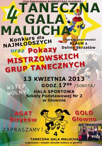 Miejski Ośrodek Kultury w Głownie zaprasza na 4 Taneczną Galę Malucha Głowno 2013, która odbędzie się 13 kwietnia, o godzinie 17.00 w Hali Sportowej przy Szkole Podstawowej Nr 2 w Głownie. W konkursie zaprezentują się młodzi tancerze formacji tanecznych AGAT STYRYKÓW i GOLD GŁOWNO, których popisowe choreografie oceni jury. Na zakończenie barwna parada taneczna.