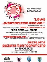 Miejskie Centrum Kultury w Bełchatowie serdecznie zaprasza na monodram pt.: "Lewa - wspomnienie prawej". Jest to spektakl, który – ze względu na chorobę aktorki – musieliśmy odwołać w marcu. Obiecaliśmy wtedy, że zaprezentujemy go w najbliższym, możliwym czasie. Idealnym terminem okazał się 9.06.2012 r., kiedy to – po raz kolejny – przed MCK stanie mammobus, a następnego dnia, na placu Narutowicza odbędzie się rodzinny festyn pt.: „Zdrowa niedziela”.