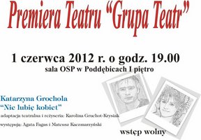 Od 5 lat przy Poddębickim Domu Kultury i Sportu działa amatorki teatr "Grupa Teatr" . W tym roku wystawiają sztukę na motywach opowiadania Katarzyny Grocholi "Nie lubię kobiet". Zapraszamy 1 czerwca 2012r. o godz. 19.00 do sali OSP w Poddębicach. Wstęp wolny.