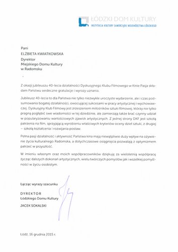 Dyskusyjny Klub Filmowy w Miejskim Domu Kultury w Radomsku od 1975 skupia miłośników kina niszowego, trudnego, problematycznego. 17 grudnia 2015 r. świętowaliśmy Jubileusz 40-lecia Dyskusyjnego Klubu Filmowego.