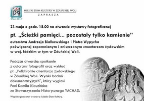 23 maja (środa) o godzinie 18.00 Miejski Dom Kultury (Łaska 12) w Zduńskiej Woli otwiera wystawę fotograficzną pt "Ścieżki Pamięci... pozostały tylko kamienie" .