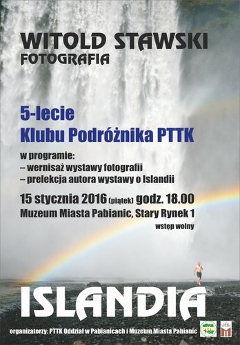 Muzuem Miasta Pabianic 15 stycznia o godz. 18.00 zaprasza na 5-lecie Klubu Podróżnika PTTK. W programie wernisaż wystawy fotograficznej Witolda Stawskiego "Islandia" i prelekcja autora.