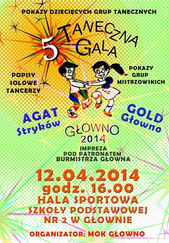 Miejski Ośrodek Kultury w Głownie zaprasza na 5 Taneczną Galę Dziecięcą Głowno 2014, podczas której zobaczyć będzie można pokazy dziecięcych i młodzieżowych grup tanecznych, zespołów Tanecznych "Agat" ze Strykowa i "Gold" z Głowna.