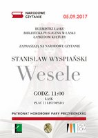 Macie jeszcze szansę na wzięcie udziału we wspólnym czytaniu "Wesela" Stanisława Wyspiańskiego! Na wydarzenie 5 września o godz 11.00 zaprasza Biblioteka Publiczna w Łasku. Wszyscy, którzy przyniosą własne egzemplarze dzieła będą mogli przybić okolicznościową pieczęć związaną z tegoroczną odsłoną Narodowego Czytania.
