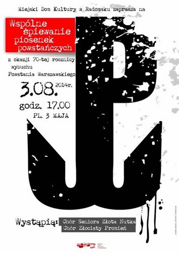 3 sierpnia o godz.. 17.00 Miejski Dom Kultury w Radomsku zaprasza mieszkańców miasta na Plac 3 Maja do wspólnego śpiewania piosenek powstańczych. W koncercie poświęconym 70. rocznicy wybuchu Powstania Warszawskiego wezmą udział: Chór „Złota Nutka” z Miejskiego Domu Kultury w Radomsku i „Chór „Złocisty Promień” Polskiego Związku Emerytów, Rencistów i Inwalidów w Radomsku. Dla publiczności przygotowane będą śpiewniki.