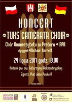 24 lipca o godz. 19.00 w Kościele pw. św Katarzyny Aleksandryjskiej w Zgierzu odbędzie się koncert chóralny z udziałem TUKS Camerata - Chóru Uniwersytetu w Pretorii. Koncert jest zapowiedzią jubileuszowej XX edycji Łódzkiego Festiwalu Chóralnego Cantio Lodziensis, która odbędzie się w dniach 18-19 listopada br. w Łódzkim Domu Kultury.