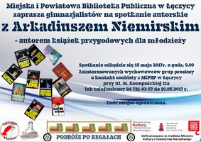Miejska i Powiatowa Biblioteka Publiczna w Łęczycy 18 maja o godz. 9.00 zaprasza gimnazjalistów na spotkanie autorskie z Arkadiuszem Niemirskim - autorem książek przygodowych dla młodzieży. Trwają zapisy! Ilość miejsc ograniczona.