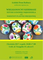 W niedzielę, 2 kwietnia, w Sali Kolumnowej Łódzkiego Domu Kultury odbędzie się Wielkanocny Kiermasz Sztuki Ludowej i Rękodzieła, w którym weźmie udział około siedemdziesięciu twórców z naszego regionu. Podczas Warsztatów Plastyki Obrzędowej, pod kierunkiem doświadczonych twórczyń ludowych, chętni własnoręcznie wykonają oryginalną palmę wielkanocną oraz poznają tradycyjne metody wykonania pisanki.
