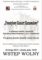 Muzeum Miasta Pabianic 22 lutego o godz. 18.00 zaprasza na kolejny koncert z cyklu "Muzyka w zacnym dworze" w wykonaniu uczniów i nauczycieli Państwowej Szkoły Muzycznej I i II st. w Pabianicach. W programie: piosenki, standardy i utwory taneczne. Wstęp wolny!