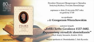 Muzeum Okręgowe w Sieradzu 12 stycznia o godz. 17.00 zaprasza na spotkanie z dr Grzegorzem Wierzchowskim, autorem książki „Feliks herbu Gozdawa 1537 – 1602. Zapomniany sieradzki dominikanin”. Spotkanie odbędzie się w Sali Rycerskiej przy ul. Dominikańskiej 2.