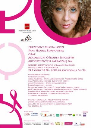 Akademicki Ośrodek Inicjatyw Artystyczych zaprasza 24 października br. o godz. 18.30 na koncert charytatywny w ramach kampanii "Nie bądź taka - pokonaj raka!" z udziałem Alicji Majewskiej i Włodzimierza Korcza. Bilety (w cenie 50 i 100 zł, do kupienia w sekretariacie AIOA) są cegiełkami na rzecz Fundacji Kocham Życie i Federacji Stowarzyszeń Amazonki.