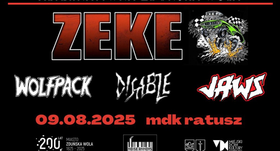 9 sierpnia w sali kameralnej MDK Ratusz wystąpią: ZEKE, WOLFPACK, JAWS, DISABLE.ZEKE – amerykański zespół pochodzący z Seattle, założony w 1992 roku. Znani są z niezwykle szybkiego, energetycznego brzmienia gitar zmieszanych z wpływami hard rocka, a czasami blues rocka. Zespół często jest porównywany do Motörhead.