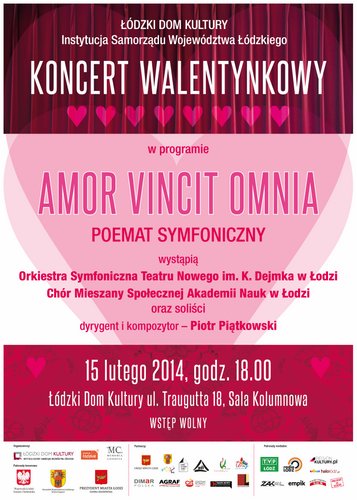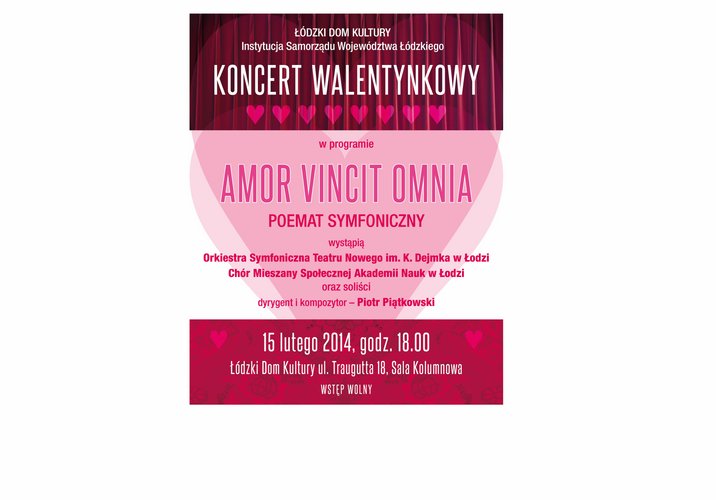 W walentynkowym nastroju 15 lutego o godz. 18.00 na scenie Łódzkiego Domu Kultury pojawi się 40-osobowa orkiestra symfoniczna Teatru Nowego pod dyrekcją Piotra Piątkowskiego, chór mieszany Społecznej Akademii Nauk w Łodzi pod dyrekcją Renaty Banackiej oraz czterech młodych solistów w poemacie symfonicznym‚ „Amor Vincit Omnia’’. Wyraziste tematy muzyczne, interesujące głosy solistów i bogaty warsztat kompozytorski pozostawią niesamowite wspomnienia.