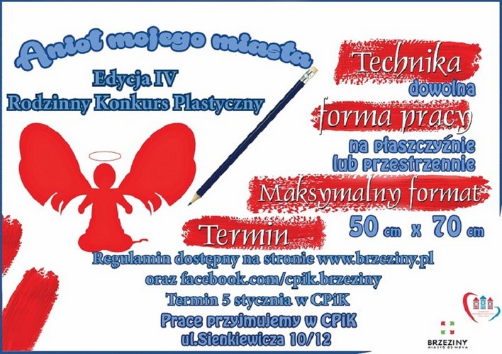 Centrum Promocji i Kultury w Brzezinach zaprasza do udziału w IV edycji rodzinnego konkursu plastycznego "Anioł mojego miasta". Konkurs ma na celu pobudzanie wyobraźni, kreacji plastycznej, zachęcanie do czerpania inspiracji twórczych z klimatu Świąt Bożego Narodzenia. Konkurs adresowany jest do mieszkańców Miasta Brzeziny, którzy zechcą wykonać pracę plastyczną związaną z tematem przewodnim konkursu, którym są anioły – w szerokim rozumieniu.