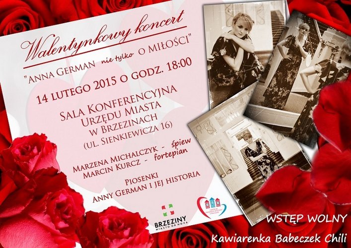 14 lutego o godz. 18.00 w Urzędzie Miasta w Brzezinach odbędzie koncert walentynkowy Anna German nie tylko o miłości. Przeboje wybitnej polskiej artystki wykona Marzena Michalczyk przy akompaniamencie Marcina Kurcza. Wstęp wolny!