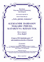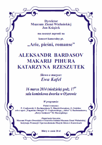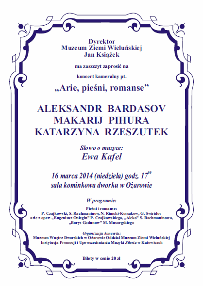 Muzeum Wnętrz Dworskich w Ożarowie Oddział Muzeum Ziemi Wieluńskiej zaprasza 16 marca o godz. 17.00 na koncert kameralny "Arie, pieśni, romanse", który odbędzie się w sali kominkowej dworku w Ożarowie. Wykonawcy: Aleksander Bardasov - baryton, Makarij Pichura - bas, Katarzyna Rzeszutek - fortepian i Ewa Kafel - słowo.