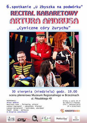 30 sierpnia (w niedzielę) o godz. 19.00 na scenie plenerowej Muzeum Regionalnego w Brzezinach rozpocznie się recital kabaretowy Artura Andrusa "Cyniczne córy Zurychu". gospodarz koncertu - Zbigniew Zamachowski już od sześciu lat zaprasza swych przyjaciół - gwiazdy polskiej sceny - w miejsce, w którym się urodził i spędził dzieciństwo. Zgodnie z konwencją koncertów "U Zybszka na podórku" na scenie pojawi się również sam gospodarz. Bilety w cenie 30 zł do nabycia w brzezińskim muzeum, CPiK oraz w sekretariacie UM w Brzezinach.