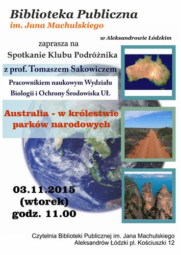 Biblioteka Publiczna im. Jana Machulskiego w Aleksandrowie Łódzkim 3 listopada o godz. 11.00 zaprasza na spotkanie Klubu Podróżnika. Gościem czytelni biblioteki będzie profesor Tomek Sakowicz, pracownik naukowy Uniwersytetu Łódzkiego, który opowie o swojej podróży do Australii. Wstęp wolny!