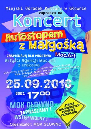 Miejski Ośrodek Kultury w Głownie 25 września o godz. 17.00 zaprasza na koncert "Autostopem z Małgośką" w wykonaniu wokalistek z Agencji Artystycznej Moc.Art z Krakowa. Artystki zaprezentują najpopularniejsze hity Karin Stanek, Czerwonych Gitar, Anny Jantar, Maryli Rodowicz oraz wielu innych wykonawców. Wstęp bezpłatny.