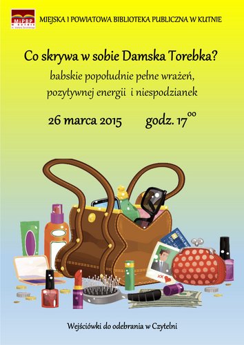Miejska i Powiatowa Biblioteka Publiczna w Kutnie zaprasza na spotkanie pn. "Co skrywa damska torebka..." Babskie popołudnie pełne wrażeń to rozmowy o diecie, fitness, a także porady spod lady, modny makijaż, kawa i inne niespodzianki. Spotkanie odbędzie się w czwartek, 26 marca o godz. 17:00.