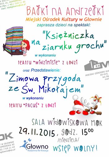 29 listopada w Miejskim Ośrodku Kultury w Głownie będzie można obejrzeć dwie bajki dla dzieci. Jedna z nich to "Księżniczka na ziarnku grochu" Teatru Widzimisię z Łodzi, a druga - "Zimowa przygoda ze Św. Mikołajem" Teatru Pacuś z Łodzi. Początek przedstawień o godz. 15.00. Wstęp wolny. Zapraszamy!