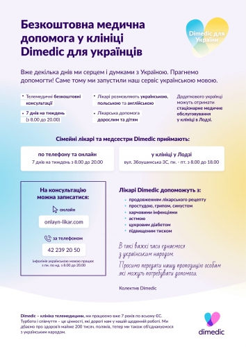 Ми хочемо допомогти людям, які цього потребують. Як онлайн-клініка, ми маємо платформу та медичну команду, які дозволяють доглядати за пацієнтами з усієї Польщі онлайн. «Ми довели ефективність наших рішень під час першої хвилі COVID-19, коли Dimedic була першою онлайнклінікою, яка діагностувала та надала терапію інфекції SARS-CoV-2», – каже Джоанна Барчіковська-Чоржевська, віце-президент Dimedic.eu. Зараз ми використовуємо досвід і знання нашої команди, щоб допомогти людям, які тікають від війни. Ми запустили онлайн-консультації 7 днів на тиждень, щоб люди могли знайти допомогу: без черг, очікування та мовного бар’єру.