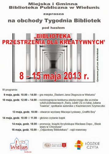 Miejska i Gminna Biblioteka Publiczna im. Leona Kruczkowskiego w Wieluniu zaprasza na obchody "Tygodnia Bibliotek" (9-16 maja), który w 2013 r. odbywał się będzie pod hasłem "Biblioteka przestrzenią dla kreatywnych".