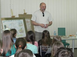 Z książką na walizkach" to akcja mająca na celu popularyzację czytelnictwa wśród najmłodszych. W ramach tego projektu 10.05.2013 r. wieluńską bibliotekę odwiedził Kazimierz Szymeczko, autor książek dla dzieci i młodzieży, który w bardzo humorystyczny sposób przybliżył kulisy swojego warsztatu pisarskiego. Uczestnicy spotkania, uczniowie ze Szkoły Podstawowej nr 4 w Wieluniu i Szkoły Podstawowej w Niedzielsku, chętnie zadawali pytania i dyskutowali z pisarzem. Na zakończenie spotkania Kazimierz Szymeczko podał wyniki wcześniej ogłoszonego konkursu plastycznego "Rany Julek! Za co lubię Juliana Tuwima". Zwyciężyli Bartek i Szymon Wojtuniak ze Szkoły Podstawowej nr 4 a wyróżnione zostały Jagoda Jędrzejczyk również ze Szkoły Podstawowej nr 4 i Nadia Zając z Młodzieżowego Domu Kultury. Nagrodami były książki naszego Gościa.