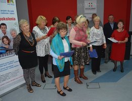 Następnie seniorzy wysłuchali występu uczestników realizowanego w CPiK projektu "Muzyka łączy pokolenia", którzy zaprezentowali się w trzech przebojach. W bogatym programie znalazły się także: transmisja on - line z prowadzącymi program "Wideoteka dorosłego człowieka", wspólne śpiewy, recytacja wierszy w wykonaniu brzezińskiej poetki.