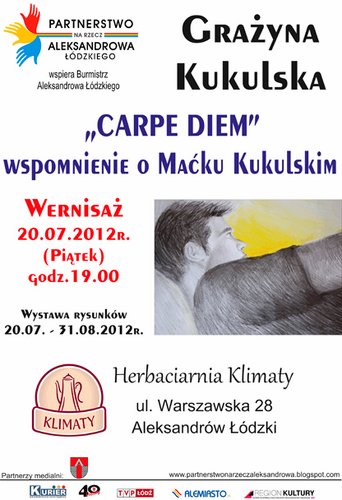 "Carpe Diem", wspomnienie o Maćku Kukulskim, wystawa rysunków Grażyny Kukulskiej. Wenisaż 20.07.2012 ( piątek ) godz.19.00 w Herbaciarni "Klimaty" w Aleksandrowie Łódzkim (ul.Warszawska 28).
