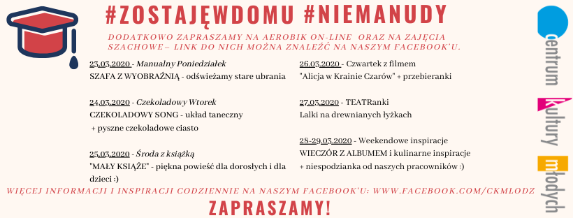 Również Centrum Kultury Młodych nie zostawiło swoich odbiorców bez kulturalnej opieki. Poniżej przedstawiamy zaplanowane na ten tydzień atrakcje. W każdą niedzielę będą pojawiały się inspiracje na kolejne dni. Zapraszamy do śledzenia aktywności na portalu Facebook.