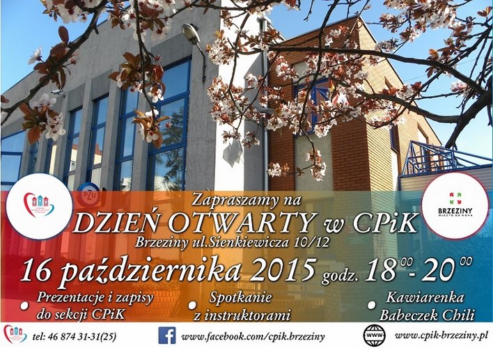Centrum Promocji i Kultury w Brzezinach zaprasza na Dzień Otwarty, który odbędzie się 16 października br. w godz. 18 - 20 w siedzibie instytucji. Podczas spotkania zostanie zaprezentowana oferta zajęciowa CPiK, będzie możliwość poznania instruktorów i zapisu na poszczególne zajęcia.