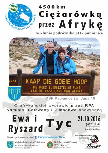 Ewa i Ryszard Tyc na najbliższym spotkaniu w Klubie PTTK Pabianice 21 października o godz. 18.30 opowiedzą o swojej trzytygodniowej podróży przez Afrykę. Pokonali 4 500 km od Przylądka Dobrej Nadziei w RPA przez Namibię i Bostwanę do Zimbabwe. Ich domem podczas podróży była ciężarówka, na której miejsce dzielili z towarzyszami podróży. Usłyszymy historię m.in. o obozowaniu na brzegu diamentonośnej Orange River, odwiedzeniu afrykańskiego kanionu Fish River Canyon, a także o spotkaniu oko w oko z gepardem. Wstęp wolny!