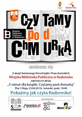 Z okazji Światowego Dnia Książki i Praw Autorskich Miejska Biblioteka Publiczna w Radomsku zaprasza na akcję 5 minut dla książki. Czytamy pod chmurką. 23 kwietnia, godz. 18.00. Pokżmy jak czyta Radomsko!
