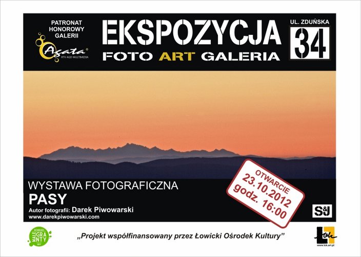 „Pasy ” to tytuł kolejnej wystawy fotograficznej, która już wkrótce będzie można oglądać w Foto Art Galerii EKSPOZYCJA 34, mieszczącej się w bramie kamienicy przy ulicy Zduńskiej 34 w Łowiczu. Wystawa, której otwarcie odbędzie się 23 października 2012 r. o godz. 16.00, składać się będzie z fotografii autorstwa fotografa Dariusza Piwowarskiego z Rawy Mazowieckiej.