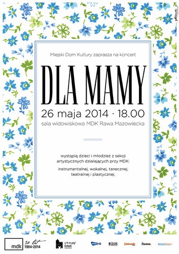 Młodzi artyści działający w Miejskim Domu Kultury w Rawie Mazowieckiej zapraszają na koncert Dla Mamy, który odbędzie się w dniu 26 maja 2014 roku o godz. 18.00 w sali widowiskowej. Swoje umiejętności i osiągnięcia zaprezentują wokaliści, instrumentaliści, recytatorzy, tancerze i plastycy. Wstęp bezpłatny.