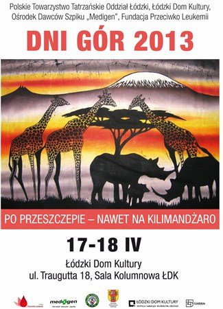Polskie Towarzystwo Tatrzańskie Oddział Łódzki, Łódzki Dom Kultury, Ośrodek Dawców Szpiku "Medigen" i Fundacja Przeciwko Leukemii zapraszają w dniach 17 -18 kwietnia na DNI GÓR 2013 pn. PO PRZESZCZEPIE - NAWET NA KILIMANDŻARO. O magicznej górze, o trudach, wzlotach i upadkach opowiedzą ci, którzy tam byli, biorcy szpiku, którzy chcą tam być - oraz inni, których góra ta inspiruje.