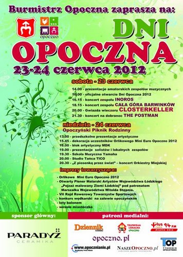 Już w najbliższy weekend 23 i 24 czerwca będziemy bawić się na Dniach Opoczna 2012. W programie moc atrakcji, m.in. piknik rodzinny, koncerty, występy taneczne. Serdecznie zapraszamy!