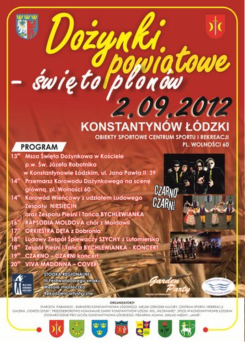 W niedzielę 2 września 2012 r, na obiektach sportowych CSiR (pl. Wolności 60) w Konstantynowie Łódzkim odbędą się Dożynki Powiatowe. Z tej okazji obok koncertów i stois regionalnych, odbędzie się III Festiwal Dobrego Smaku. Serdecznie zapraszamy i życzymy "smacznego".