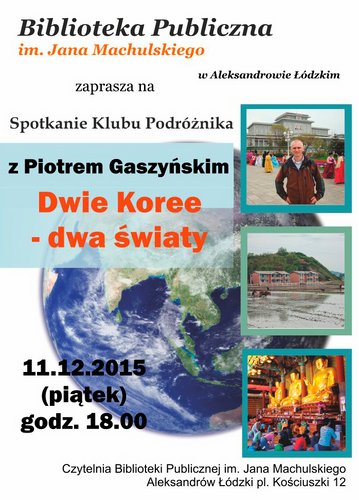 11 grudnia o godz. 18.00 w ramach Klubu Podróżnika w Bibliotece Publicznej w Aleksandrowie Łódzkim będzie można posłuchać opowieści Piotra Gaszyńskiego oraz podziwiać niezwykłe zdjęcia z egzotycznej podróży do Korei Północnej i Południowej. Wstęp wolny!