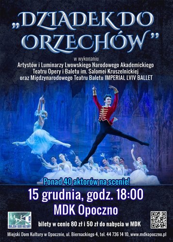15 grudnia o godz. 18.00 na scenie Miejskiego Domu Kultury w Opocznie zobaczymy spektakl baletowy „Dziadek do orzechów” w wykonaniu Artystów i Luminarzy Lwowskiego Narodowego Akademickiego Teatru Opery i Baletu im. Salomei Kruszelnickiej oraz Międzynarodowego Teatru Baletu IMPERIAL LVIV BALLET.