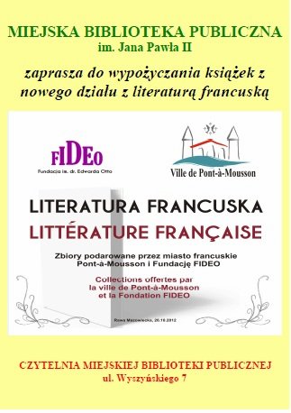 W piątek 26.10.2012 r. w Czytelni Miejskiej Biblioteki Publicznej odbyło się uroczyste otwarcie działu z literaturą w języku francuskim. Zbiory zostały podarowane przez miasto francuskie Pont-?-Mousson oraz Fundację im. dr. Edwarda Otto.